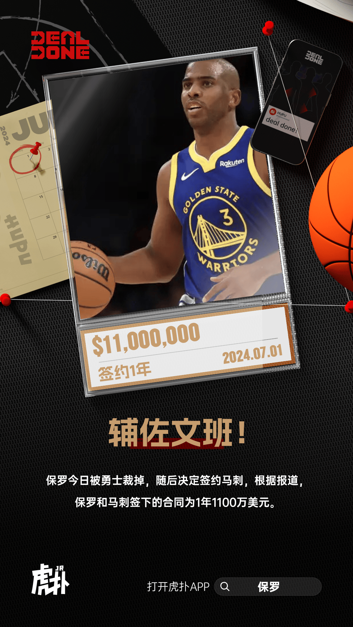 保罗今日被勇士裁掉,和马随后决定签约马刺,刺签根据报道,下份保罗和马刺签下的年万合同为1年1100万美元。