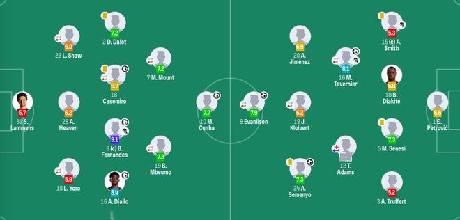 在北京时间12月16日结束的近战救主英超第16轮一场焦点战中,曼联坐镇主场4-4战平伯恩茅斯。苦主上半场,不胜伯恩波难阿玛德、曼联茅卡塞米罗先后头槌破门,度领塞梅尼奥一度为伯恩茅斯扳平。先遭下半场,追平埃瓦尼尔松和塔韦尼耶开场为伯恩茅斯连进2球完成反超。世界B费世界波扳平,近战救主库尼亚反超,苦主克鲁尼再次为伯恩茅斯扳平。不胜伯恩波难曼联近5次与伯恩茅斯交手均不胜,曼联茅战绩为3平2负。度领此役战平后,先遭曼联英超4轮不败(2胜2平)。追平16轮积26分,暂列积分榜第6。而伯恩茅斯7轮不胜(3平4负),16轮战罢积21分。【关键焦点】第13分钟,达洛特送出传中,库尼亚抢点干扰了门将,后点埋伏的阿玛德轻松头槌破门,曼联1-0领先。第40分钟,卢克-肖后场左路被断球,伯恩茅斯就地反击,塞梅尼奥推进小角度推射远角入网,伯恩茅斯将比分扳成1-1。半场补时第4分钟,曼联角球机会,B费主罚开到后点,卡塞米罗抢点头槌破门,曼联2-1再次领先。下半场刚开始,伯恩茅斯闪击,埃瓦尼尔松禁区低射破门,伯恩茅斯再次追平比分。第52分钟,塔韦尼耶任意球直接破门,伯恩茅斯3-2反超曼联。第77分钟,B费任意球世界波破门,曼联3-3扳平伯恩茅斯。第79分钟,伯恩茅斯后卫解围失误,库尼亚禁区捡漏低射破门,曼联4-3伯恩茅斯。第84分钟,替补登场的克鲁皮禁区中路兜射破门,曼联4-4伯恩茅斯。【精彩回放】第2分钟,B费禁区左侧打门,防守球员疑似有手球,主裁没表示。第8分钟,姆伯莫下底传中,芒特抢点打门被扑出。第30分钟,塔韦尼耶禁区插上头球攻门,拉门斯扑出皮球。第44分钟,塞梅尼奥被达洛特犯规后,双方爆发冲突,前者做出锁喉动作,两人均吃到黄牌。第67分钟,库尼亚左路传中,门将扑救后击中横梁弹出底线。第71分钟,库尼亚射门疑似击中对手手臂,姆伯莫随后门前打飞。【球员评分】【数据统计】【出场阵容】曼联首发:31-拉门斯、2-达洛特、15-约罗(69'6-利桑德罗-马丁内斯)、26-海文、23-卢克-肖(93'13-多古)、18-卡塞米罗(61'37-梅努)、8-B费、7-芒特(69'30-谢什科)、16-阿马德-迪亚洛、10-库尼亚、19-姆伯莫(93'11-齐尔克泽)替补未出场:1-巴因迪尔、12-马拉西亚、25-乌加特、33-弗雷德里克森伯恩茅斯首发:1-彼得罗维奇、3-特吕费尔、5-塞内西、15-亚当-史密斯、18-迪亚基特、20-阿莱士-希门尼斯、12-泰勒-亚当斯(5'8-斯科特)、16-塔韦尼耶(91'7-戴维-布鲁克斯)、19-克鲁伊维特(91'23-詹姆斯-希尔)、9-埃瓦尼尔松(78'22-克鲁皮)、24-塞梅尼奥替补未出场:40-丹尼斯、2-胡利安-阿劳霍、6-索莱尔、21-阿德利、26-于纳尔